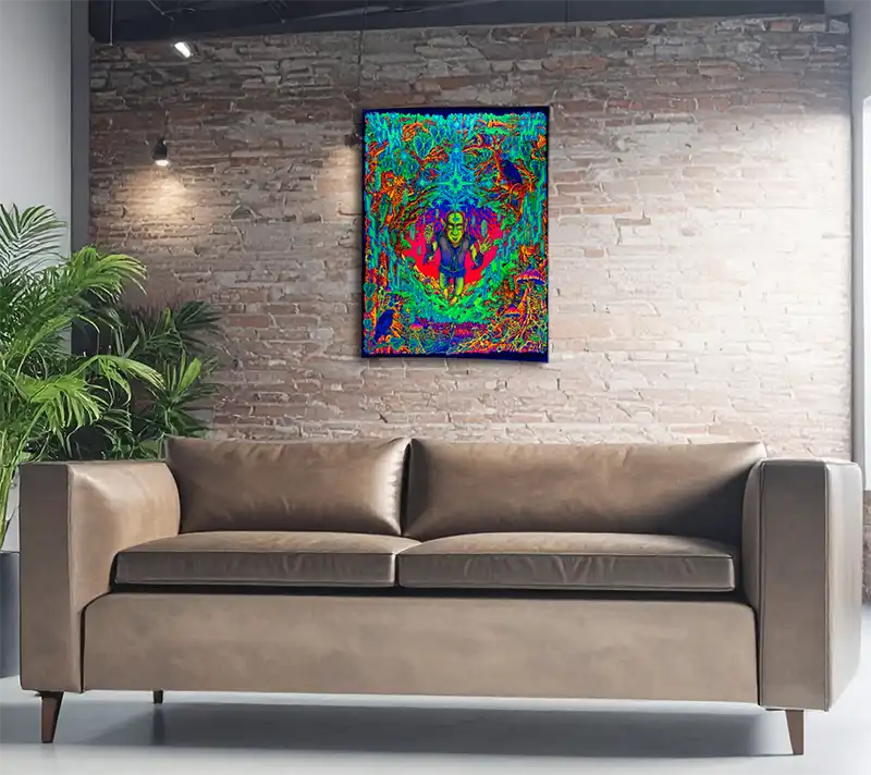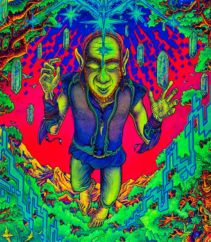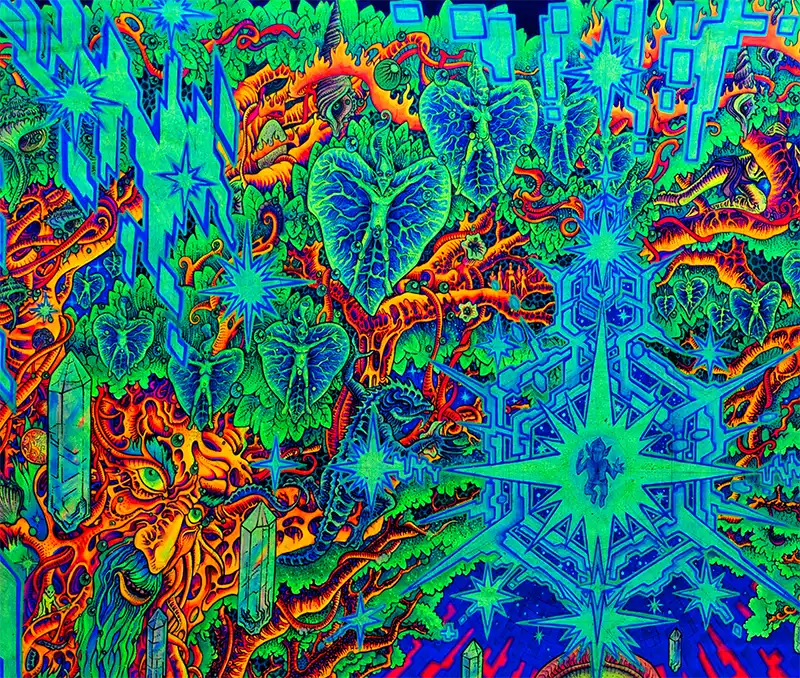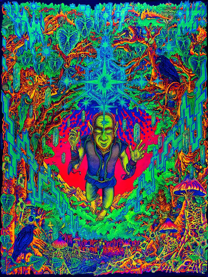 In grellen Neonfarben öffnet sich ein psychedelisches Panorama, in dem ein schwebendes Fabelwesen zum Führer durch eine verwobene Traumlandschaft wird. Kristalle fallen wie gefrorene Gedanken, während verzerrte Bäume und Pilzkulturen ein pulsierendes Biotop formen. Das Werk des Künstlers Felix Stoever wirkt wie ein visueller Ritus: ein Grenzraum zwischen Naturmythos und digitalem Fiebertraum, der den Betrachter zugleich verführt und herausfordert.
