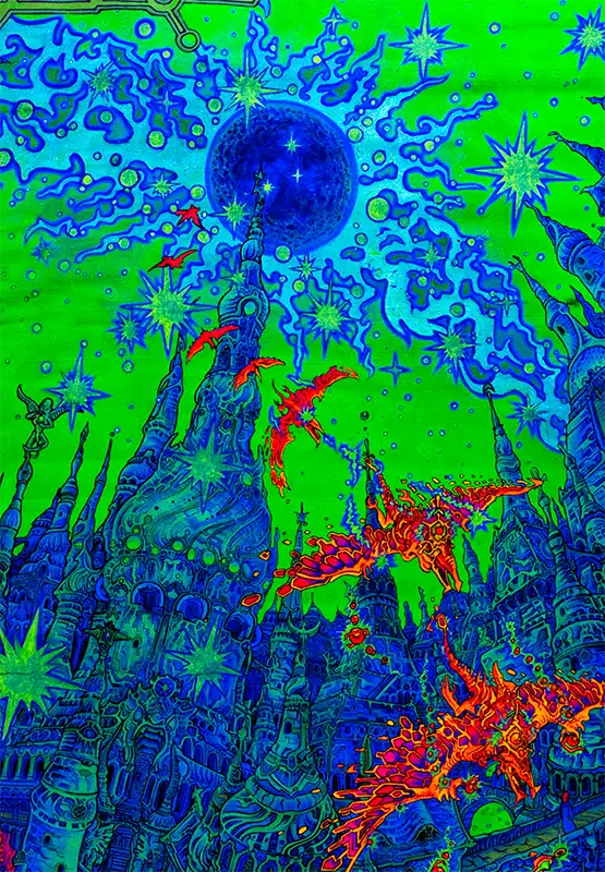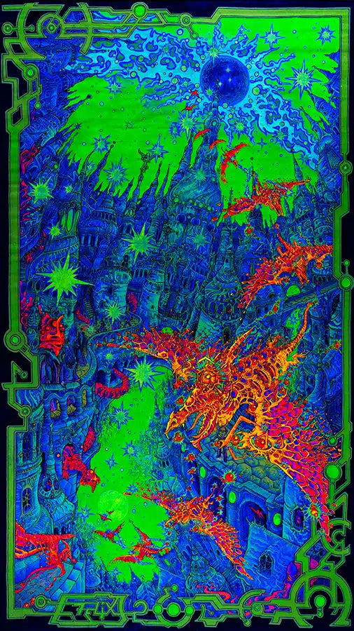 In Felix Stoevers neongetränktem Fantasiepanorama pulsiert eine fieberhafte Energie: Über zerklüfteten Turmlandschaften kreisen glühende Kreaturen, während ein kosmischer Himmel in giftigem Grün und tiefem Blau explodiert. Das Werk wirkt wie ein visionäres Fieberbild, in dem Mittelalter, Science-Fiction und psychedelische Ornamentik zu einem rauschhaften Gesamterlebnis verschmelzen.