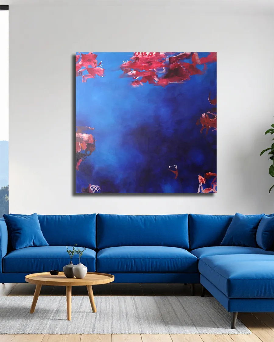 Avec son format carré généreux de 160 x 160 cm, « Coraux rouges dans les profondeurs marines » est une œuvre impressionnante qui attire tous les regards dans les grands salons, les bureaux, les cabinets médicaux ou les halls d'hôtel. L'alliance du bleu profond et des rouges éclatants crée une atmosphère apaisante et apporte une touche d'élégance maritime à toute pièce – un choix idéal pour les amateurs de représentations de la nature et d'art marin abstrait.