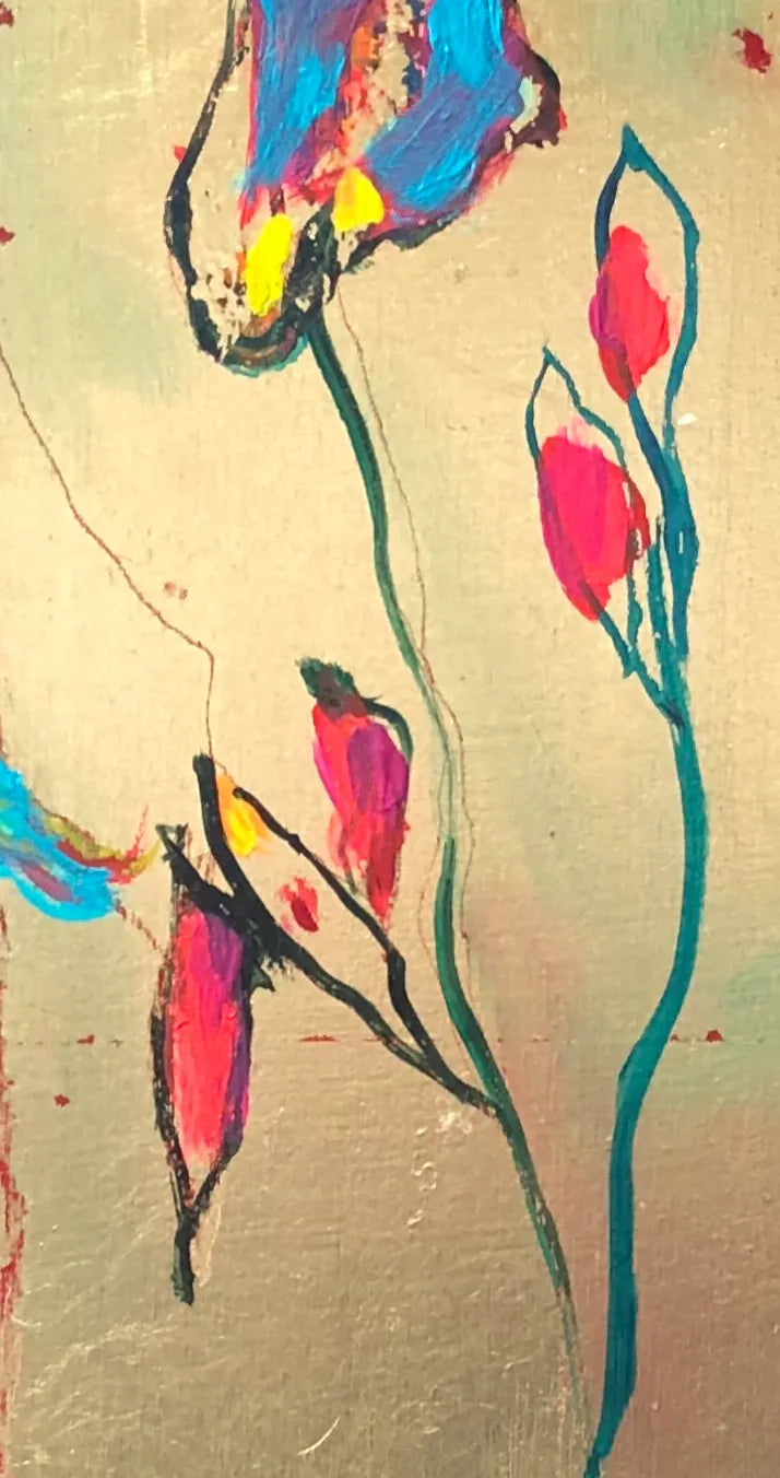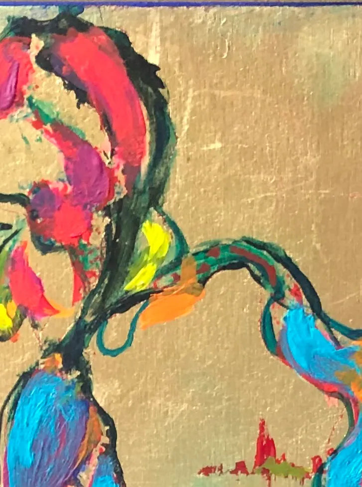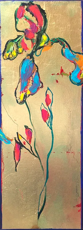 Es handelt sich um ein Gemälde, das eine Irisblüte auf einem goldenen Hintergrund darstellt. Die Iris ist in leuchtenden Farben wie Blau, Rot, Pink und Grün gemalt. Für den Hintergrund hat die Künstlerin eine Blattgoldtechnik verwendet, die dem Werk eine strukturierte und schimmernde Oberfläche verleiht
