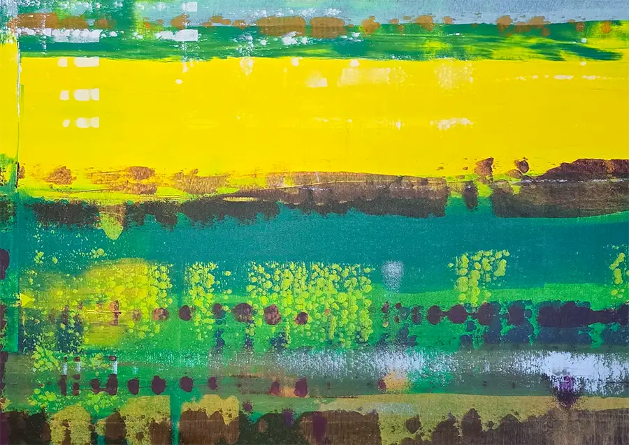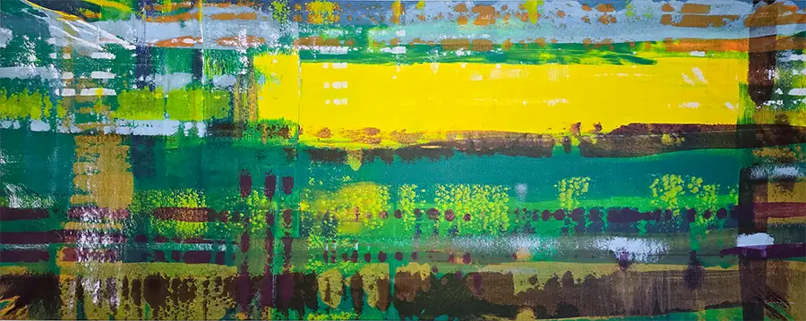 Das Gemälde besticht durch seine horizontale Schichtung und lebendige Farbkomposition. Satte Grüntöne treffen auf leuchtende Gelbtöne, ergänzt durch erdige Nuancen und markante Spachtelspuren. Die Komposition erinnert an eine abstrahierte Wiese im frühen Morgenlicht und vermittelt durch ihr panoramisches Format eine beruhigende Atmosphäre.