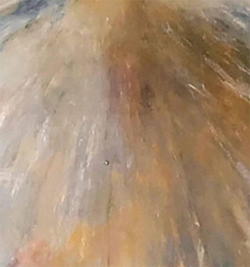 Dieses Bild zeigt eine weite, helle Landschaft, die an einen Strand oder eine Wattenmeer-Ebene erinnert. Der Himmel ist bedeckt und bewölkt, in gedeckten Grau- und Blautönen gehalten. Der Boden ist in warmen, ockerfarbenen Tönen sowie Grau und Blau gemalt und wirkt nass und spiegelnd. Drei kleine, dunkle Figuren sind in der Ferne zu erkennen, die eine weite, einsame Atmosphäre vermitteln. Die Maltechnik ist impressionistisch und pastos, was dem Bild eine dynamische und leicht melancholische Stimmung verleiht.