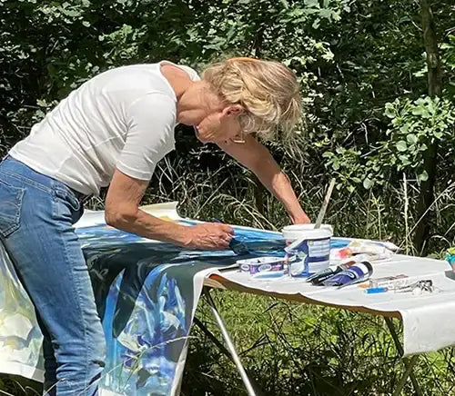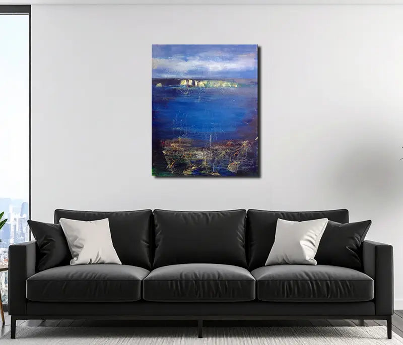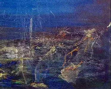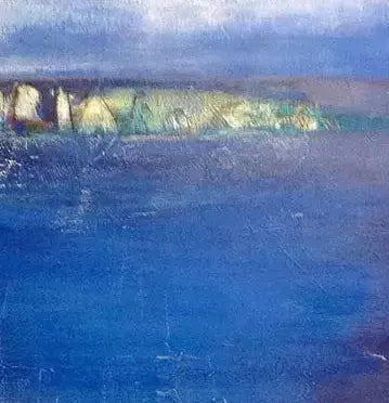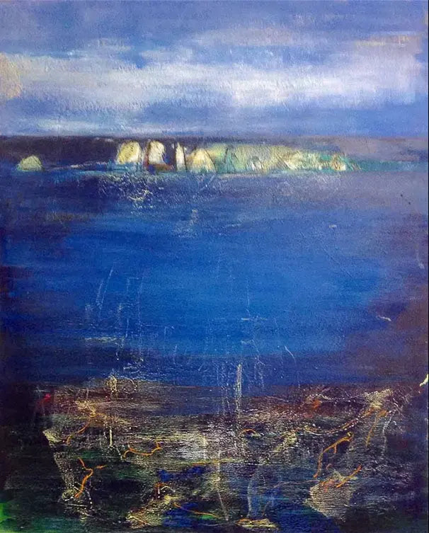 Das vorliegende Werk, ausgeführt in Mischtechnik, präsentiert eine abstrahierte Küstenlandschaft. Die Komposition wird dominiert durch die tiefblaue Farbfläche des Meeres im Vordergrund, die durch vertikale und horizontale Kratzspuren eine haptische Textur erhält. Im oberen Drittel kontrastieren helle, pastose Wolkenformationen mit einem dunklen Himmel. Eine Reihe von hellen, fast leuchtenden Klippen markiert die Horizontlinie und trennt die dynamische See von der oberen Bildhälfte. Die untere Partie zeigt dunkle, fast chaotische Strukturen mit Akzenten in Ocker und Weiß, die an aufgewühlte Untiefen oder eine abstrakte Darstellung des Grundes erinnern. Die expressive Farbgebung und die gestische Pinselführung verorten das Werk in der Tradition des Abstrakten Expressionismus oder der informellen Malerei der Nachkriegszeit.