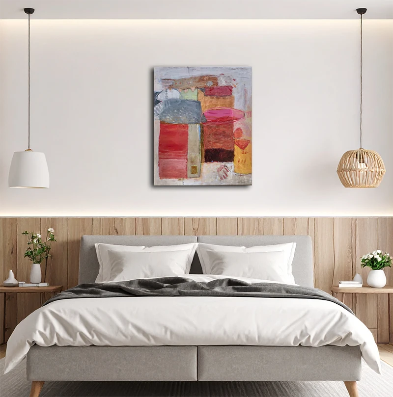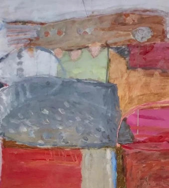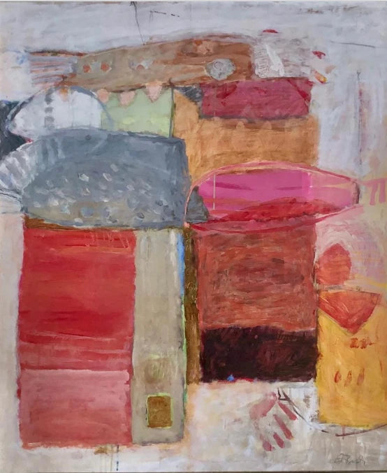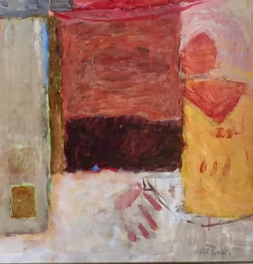 Dieses abstrakte Gemälde zeichnet sich durch eine komplexe Komposition aus gestapelten, blockartigen Formen aus. Die kraftvolle Farbpalette umfasst erdige Töne wie Rot und Braun, kontrastiert durch leuchtende Akzente in Pink und Gelb. Die Pinselführung ist abwechslungsreich und reicht von pastos bis flächig. Im unteren Bereich deuten eine stilisierte gelbe Gestalt und eine andeutungsweise dargestellte Hand figürliche Elemente an. Das Werk erzeugt eine dynamische Spannung zwischen strenger Form und spontaner Geste.